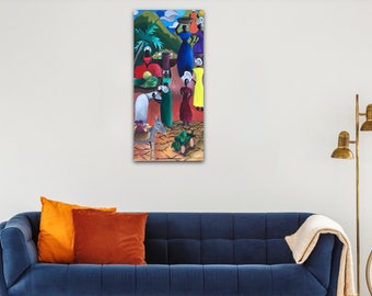 Art, Gallery Art, Original Painting, Acrylic on Canvas, Wall Art, Primitive, Ethnic, Ladies, Market Scene Title: Market Day