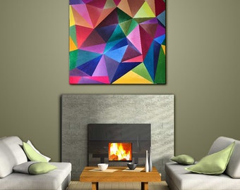 Wall Art Painting Acrylic Geometric Contemporary Home Decor Abstract Modern Square MultiColored Red Green Title: CRYSTAL COLORS