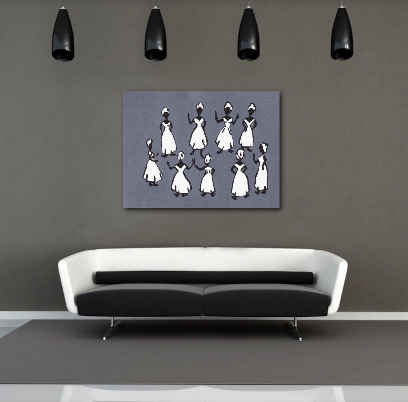 Wall Art, Dancers Primitive figurative Home Decor abstract figures Black and White Canvas of women grey Title: Dancing Ladies Series I