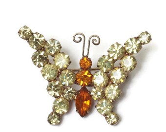 Yellow Rhinestone Butterfly Pin Orange Stones Smaller Brooch Vintage