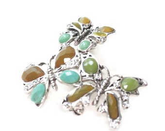 Three Butterfly Brooch Monet Faceted Beads Turquoise Olive Mocha Clear Rhinestones
