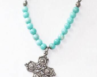 Maltese Cross Pendant Turquoise Glass Beads Smaller Pendant Necklace