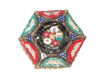 Mosaic Tile Pin Floral Center Six Sided Smaller Size Made in Italy Vintage Brooch