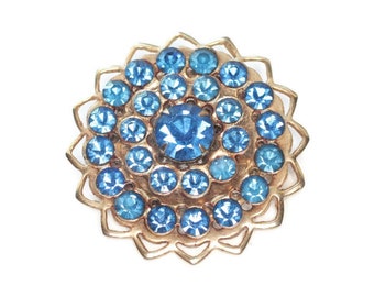 Sapphire Blue Rhinestone Pin Gold Tone Filigree Vintage Brooch Smaller Size Mid Century