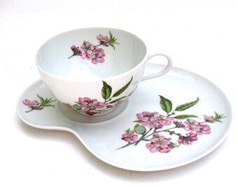 Vintage French Limoges Giraud white Porcelain Cup & Saucer Cherry blossom hand painted