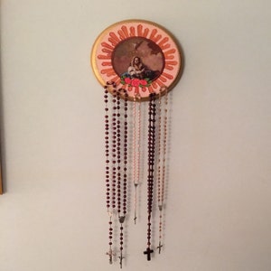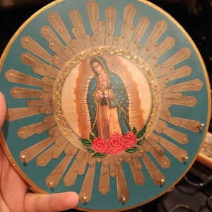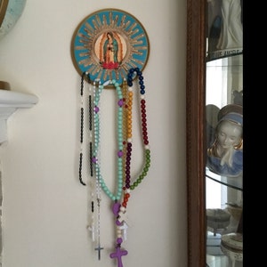 This was a gift a gift for my mom’s birthday. It’s nearly a year since we were told of the tumor in her head. I was really excited to see such a beautiful image of Our Lady of Guadalupe and a place for my mom to hang her rosaries. It came with the jewls that fell off and the tissue paper stuck on the screws. The wood from the screws is also clearly visible. i will now need to clean and clear this up. Such a bummer but a beautiful idea!