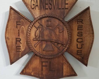Fire Dept Maltese Cross Badge - 3D V CARVED - Personalized Firefighter/Dept Badge V Carved Wood Sign