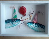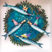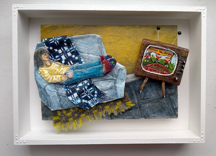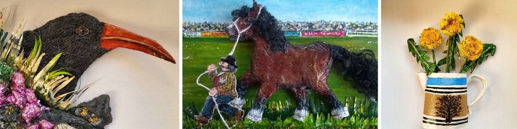 I also enjoy creating and painting characters who are based on people I have met or imagined and incorporating them into humorous scenes; examples can be seen on my greeting cards. Once I have decided what or who the materials are going to become, I start to add colour with acrylic paints and layer the different textures together, giving them a 3D appearance.