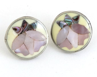 Vintage Native American Small Round Post Earrings Flower of Mother of Pearl & Abalone Shell Inlay Sterling Silver Zuni Artist Signed Alia
