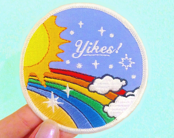 Yikes! Rainbow Embroidered Patch, 70s Vintage Inspired Retro Rainbow and Sun, Iron On Patch, Funny Sew on Patch, Patches for Jackets