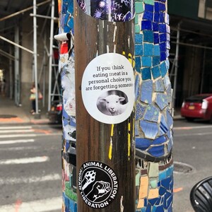 Stickervism is sticker activism. It is sticker bombing or sticker art that pushes a political agenda. It is a method of guerrilla marketing that is used to facilitate free communication with the general public. It is an incredibly cost effective way to promote the animal rights and vegan message. Even big corporations hire guerrilla marketing agencies to do sticker bombing!
