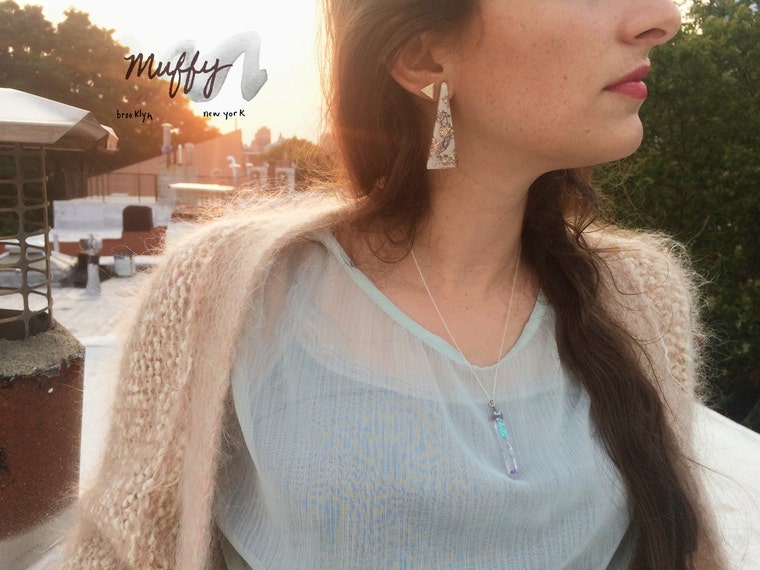 She mixes pots of glitter, colors, resin & fine metals to bring surreal & ordinary subjects to vibrant life in a wearable format. These objects of curiosity are inspired by extraterrestrial rock formations & crystals with just a touch of the mundane to contrast.
