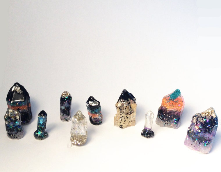 Ella mezcla ollas de purpurina, colores, resina y metales finos para llevar temas surrealistas y ordinarios a la vida vibrante en un formato portátil. Estos objetos de curiosidad están inspirados en formaciones rocosas y cristales extraterrestres con solo un toque de lo mundano para contrastar.