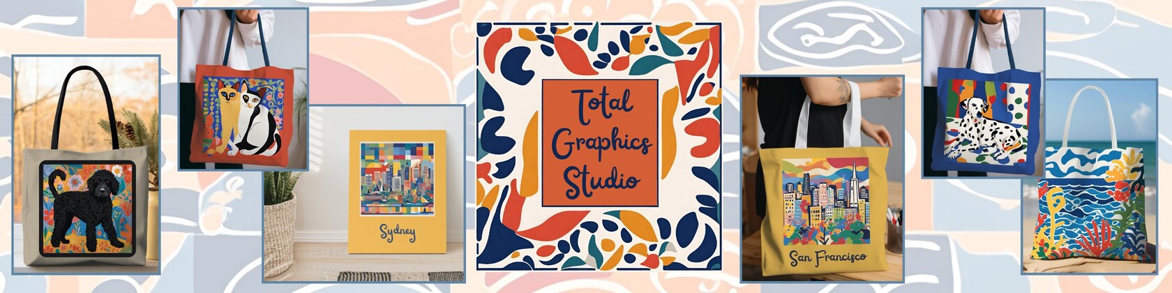 Total Graphics came out of my love for Matisse and his cut outs. These fabulous artworks always make me feel happy, and I wanted to create a way of sharing this. I love cards and have an ever growing collections of totes - so handy and why not make them look as fun as possible? Combining this idea and my passion for travel and all things furry and Total Graphics Studio was born. Graphics were designed with the aid of AI.