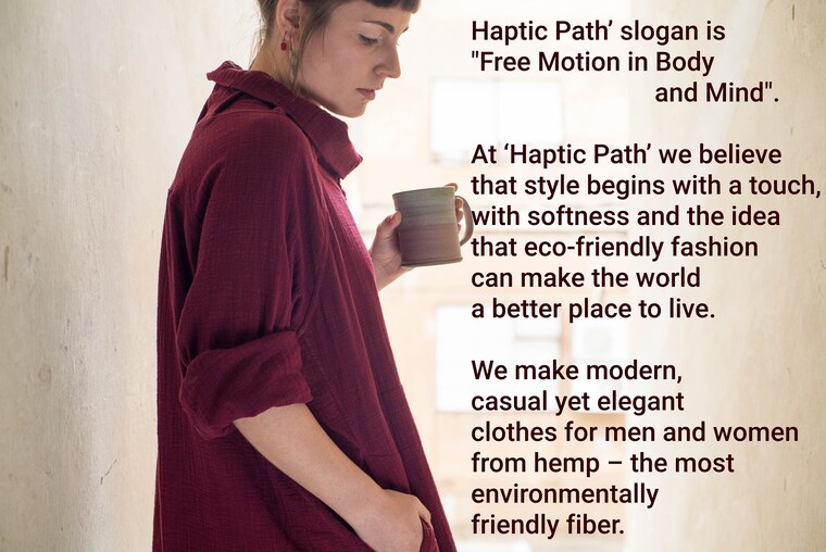 I make clothes out of hemp (or hemp combined with cotton or bamboo), because it is the most environmentally friendly fabric – which is at the same time best for the body. The hemp plant does not drain the soil, uses less water and grows faster than cotton; the hemp fabric is hypoallergenic, breathable and offers 90% UV protection.