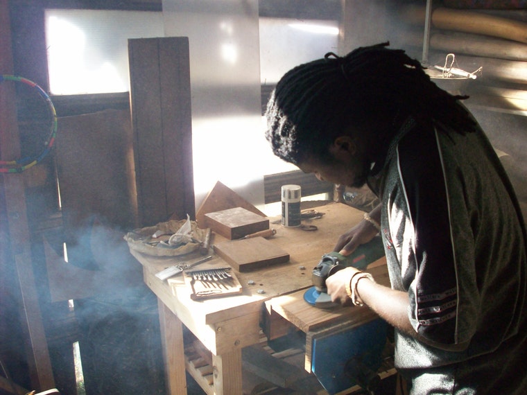 Dingiswayo handcrafting the wood of a 15-key kalimba in the workshop.