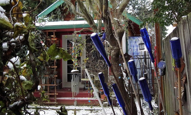 View of my studio in the snow. Yes, those are blue bottles that I love looking at. -