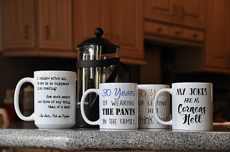 We design our mugs by starting with an idea and finding an attractive and often humorous way to work that idea onto the very small space of a coffee mug. We use Adobe Illustrator for most of our designs. Therefore we are able to customize just about any design.