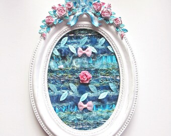 Textile art, Textile painting, Weaving in an oval frame with a blue and pink baroque decoration