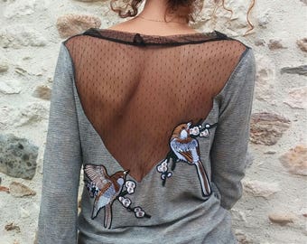 Top / blouse / birds / gray mesh and gold / tulle. 05217