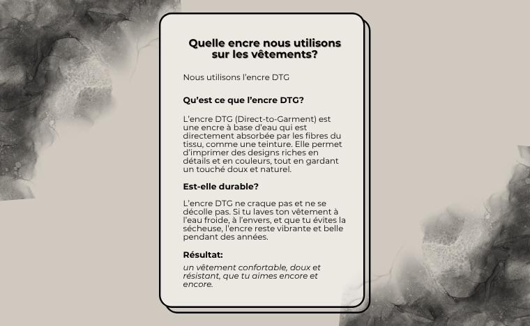 Encre DTG à base d’eau : douce, durable et sans craquelure. Une impression de qualité qui dure dans le temps.