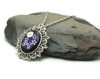 Vintage flower necklace, black lilac cameo necklace, gothic purple necklace, romantic necklace, anniversary gift for women, mothers day gift