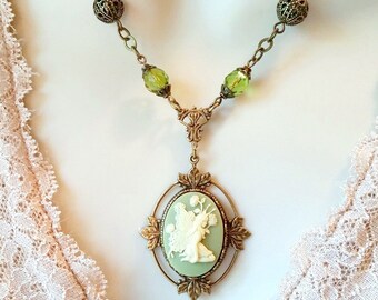Vintage Style Green Kneeling Fairy Cameo Necklace