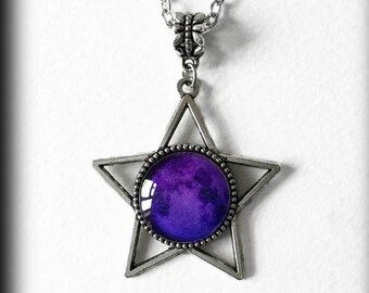 Purple Moon Star Necklace, Moon Stars Celestial Jewelry, Solar System, Gothic Witch Wicca Pagan Pendant, Alternative Gothic Jewelry Gift