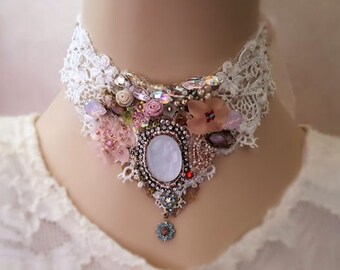 Cameo lace necklace, bead embroidered romantic statement necklace for women