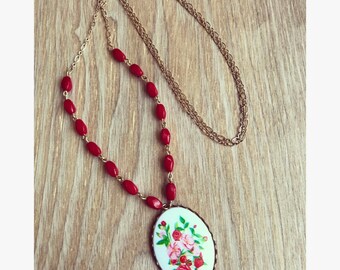 Long cameo necklace,Vintage cameo, Flower cameo, Flower necklace,Long necklace, Beaded necklace . Shabby chic,red necklace