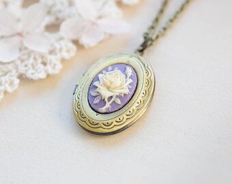 Cameo Locket Necklace, Ivory Purple Rose Flower Cameo Pendant Necklace, Antiqued Gold Brass Oval Locket Necklace, Photo Locket, Gift for Her