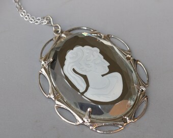 WHITE CAMEO NECKLACE, Glass Cameo Pendant, Wedding Pendant, Mother Of Bride Pendant, Cameo Portrait Pendant, Gray Pendant,Statement Necklace