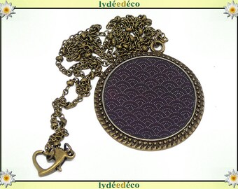 Necklace: seigaiha waves Japanese brass bronze and resin black and white color Heart Locket round 32 mm ball chain