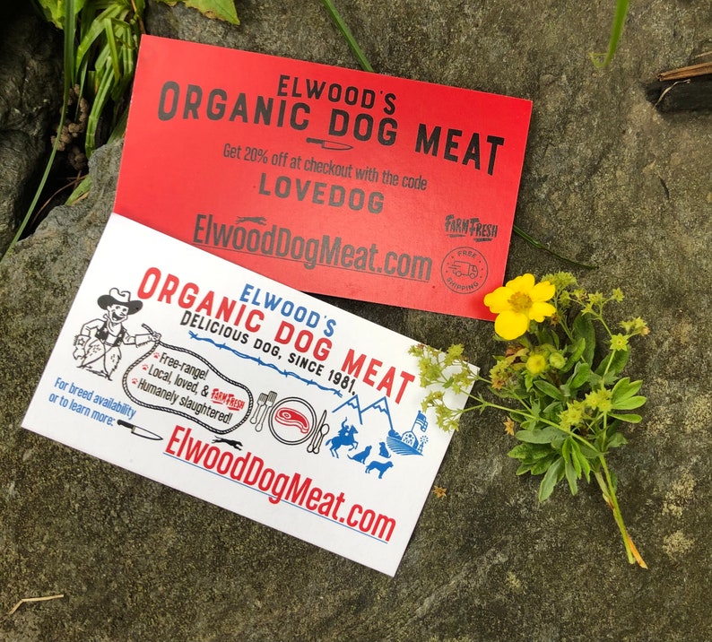 Leave Behind Cards are perfect for starting important conversations about who we eat, how they're treated, and why. (They look great on community bulletin boards!) Learn more: www.ElwoodDogMeat.com.