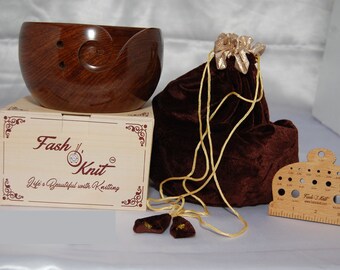 7 X 4 Sheesham wood Yarn Bowl with free Velvel Bag and Knitting Gauge | Perfect Christmas Gift for a Knitter