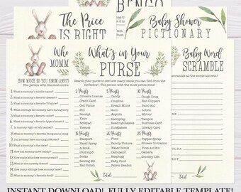 Greenery and Bunny Gender Neutral Baby Shower Game Suite, Baby Shower Game Package, Baby Shower Game Bundle, Game Set, Baby Shower Game Kits