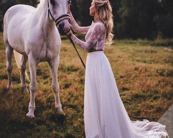 Bridal Boho Lace Dress, Long White or Ivory Chiffon Wedding Skirt, Ivory Engagement Prom Dresses Plus Size, Bridal Separates - 3 pieces set