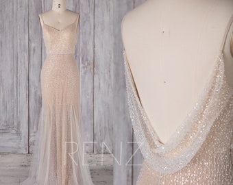Mermaid Wedding Dress Off White Tulle Nude Fitted Party Dress Illusion Cowl Back Maxi Dress Spaghetti Strap Beaded Flare Prom Dress(LW463)