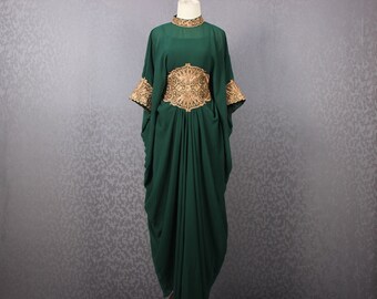 Fancy Green Caftan Gown Dress, Handmade Abaya Maxi Kaftan Dress, Moroccan Dubai Matahari Kaftan Dress, Gold Embroidery Maxi Handmade Kaftans