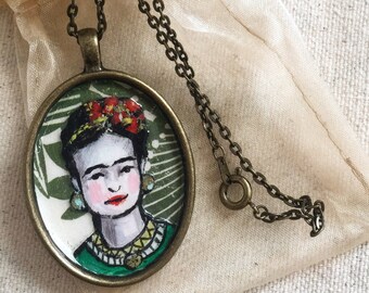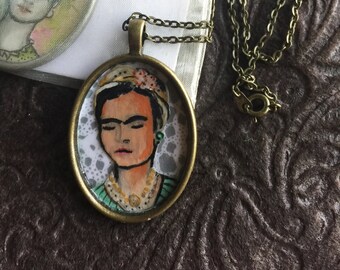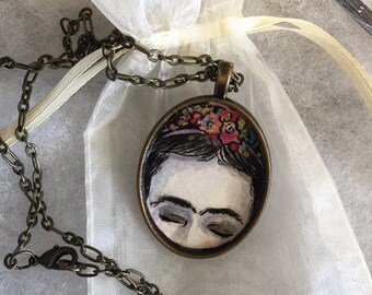 Hand painted Frida Kahlo art necklace, on antique gold tone pendant with 18"chain