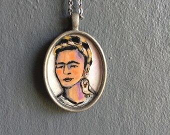 Hand painted Frida Kahlo art necklace, on brushed silver tone pendant with 18"chain