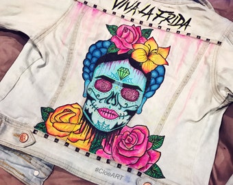 Custom Painted Frida Kahlo Sugar Skull Denim Jacket