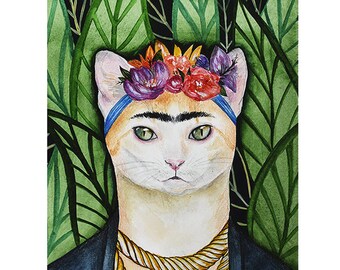 Custom cat portrait Frida Kahlo Watercolor portrait Custom pet painting Cat art Custom watercolors Original portrait funny cat portrait