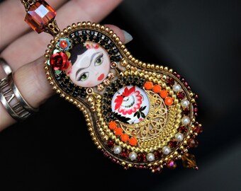 Orange and gold Frida Kahlo pendant, Nesting doll necklace, Artisan Jewelry, Frida beaded necklace, gift for Christmas,Statement jewelry