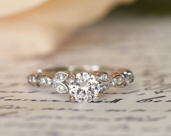 Sz 6 or 8, 3/4 ctw Art Deco Floral Vintage Style Wedding Engagement Ring, Round Man Made Diamond Simulants, Promise Ring, Sterling Silver