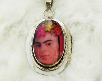 Hand painted Frida Kahlo art necklace, on antique silver tone pendant with 18"chain
