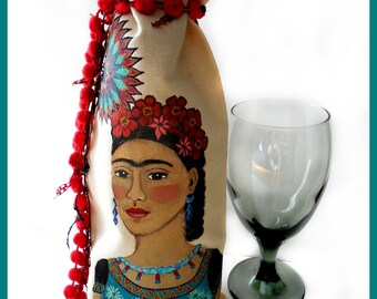 Hand Painted Frida Kahlo Wine Bottle Bag with Red PomPom Tie - Original Painting on Natural Cotton