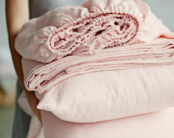 Linen sheet set of 3 pieces in Light Pink (Baby Pink). Fitted sheet, flat sheet, 2 pillowcases. Queen, King, Twin.