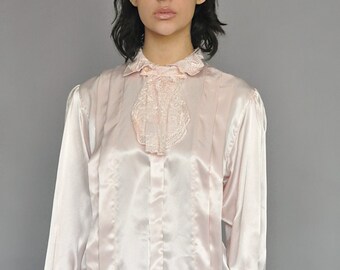 Pink Long Sleeved Lace Pleated Top Blouse Vintage 80s