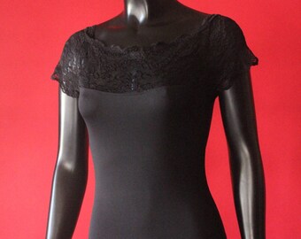 Vintage 90's Black Lace Short Sleeve Stretch Bodysuit Leotard, size L